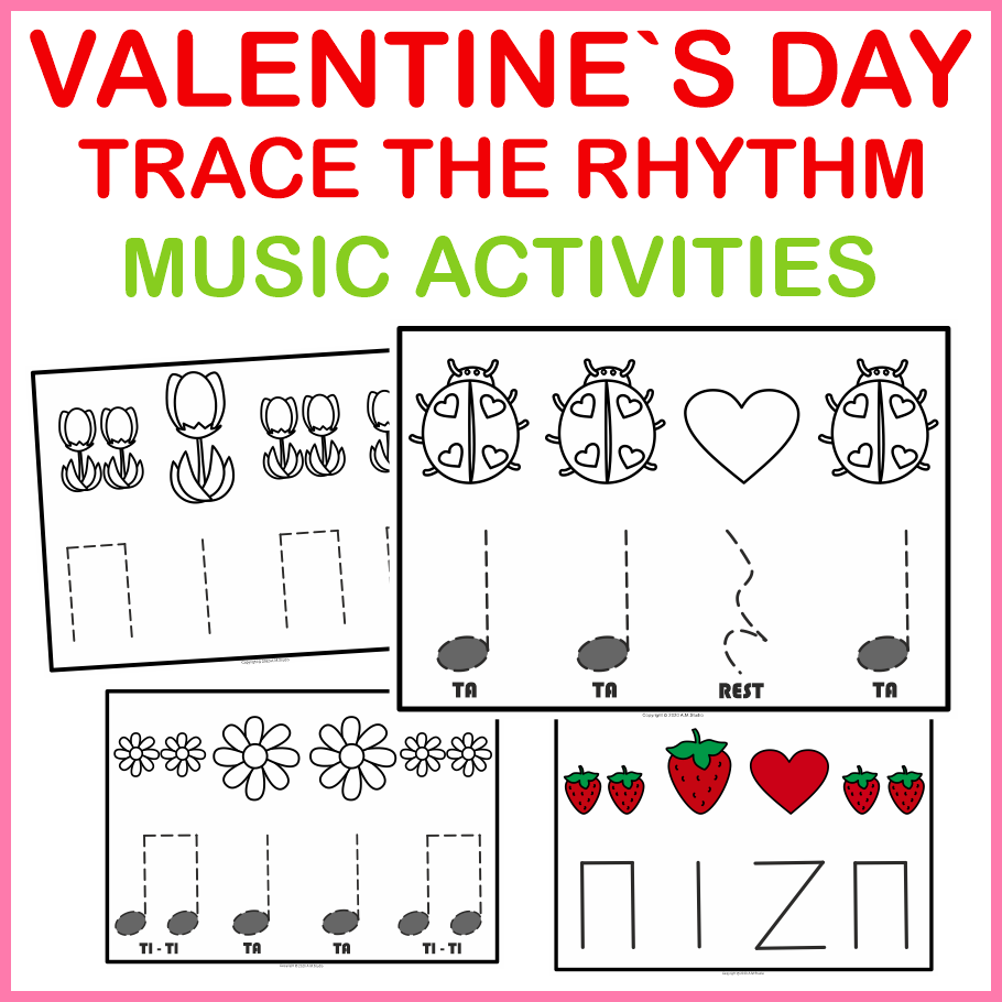 This Valentine’s Day-themed music tracing and rhythm packet provides young learners with a hands-on and visual way to practice rhythm notation. It focuses on the core rhythmic values ta (quarter note), ti-ti (paired eighth notes), and rest (quarter rest) through coloring, tracing, and clapping activities that reinforce early rhythm literacy in an engaging seasonal format.